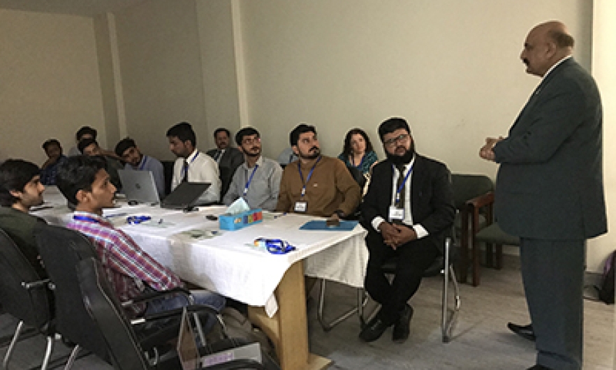 Dr. Minhaj Us Siraj from the Ministry of National Health Services, Regulations and Coordination, Pakistan, leads a presentation for the data collectors.