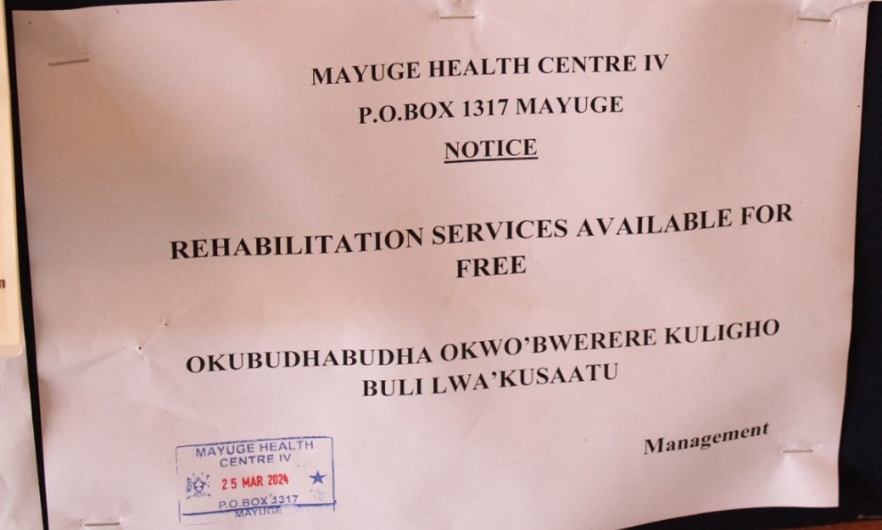 Sign at Mayuge Health Center IV advertising subsidized rehabilitation services. Photo courtesy of Fred Echeku for ReLAB-HS.