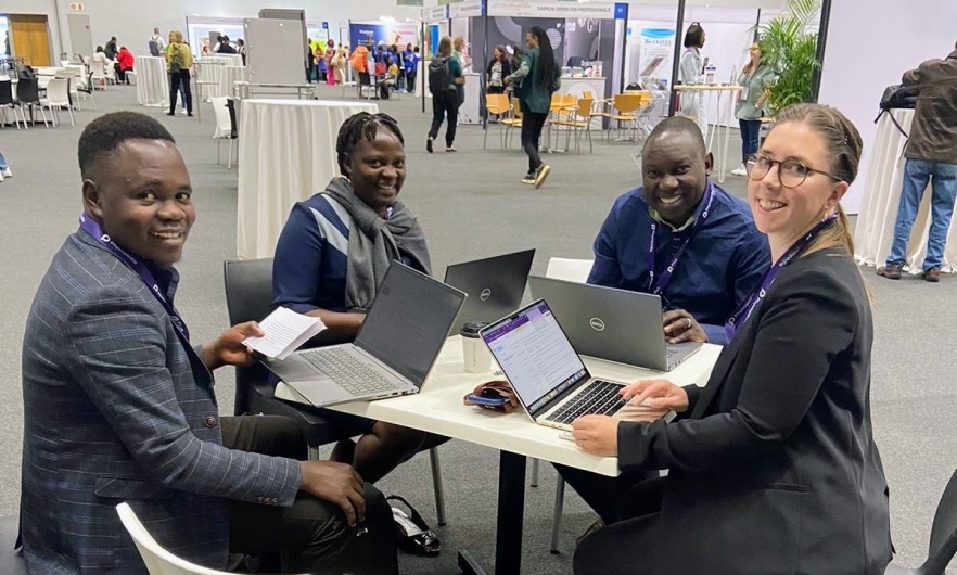 Calvin Kisembo, Margaret Namatovu, Herbert Omoding, and Yara Peterko, preparing for the IRETT presentations. Photo courtesy of Physiopedia.