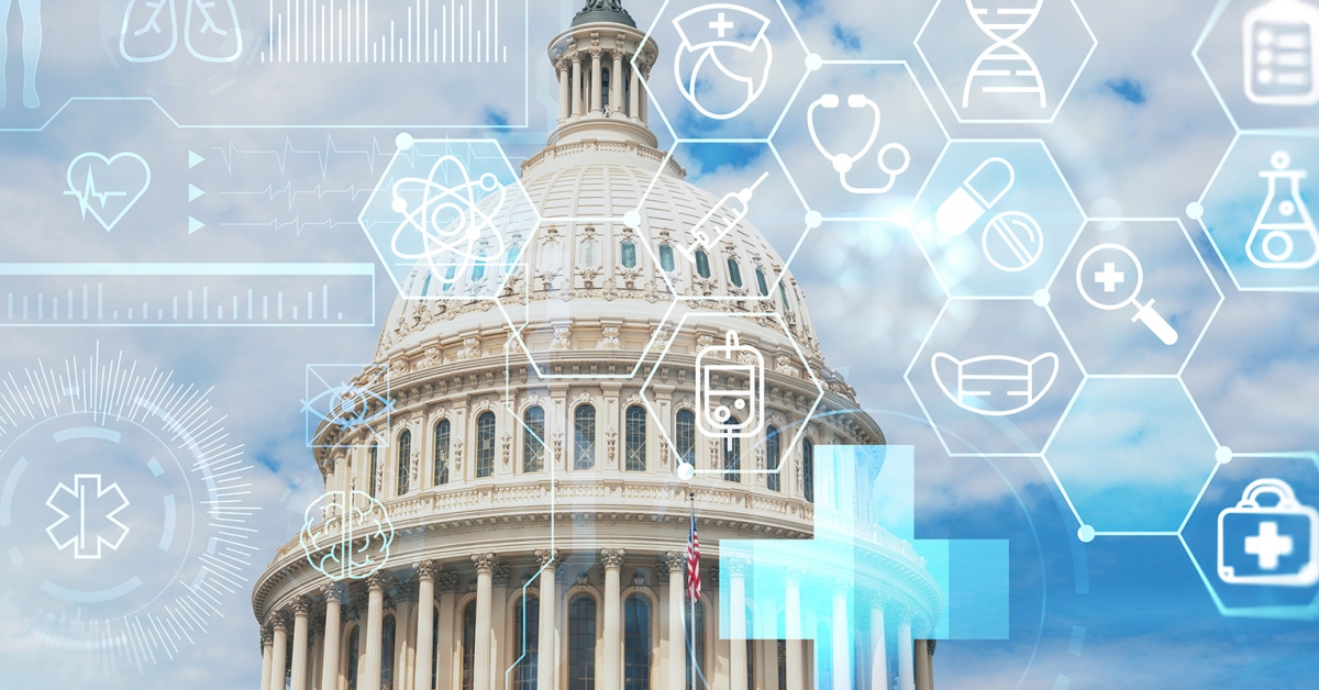 Capitol dome building exterior, Washington DC, USA. Home of Congress and Capitol Hill. American political system. Health care digital medicine hologram. The concept of treatment and disease prevention