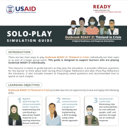 Before you begin Outbreak READY 2! as a solo player, we recommend downloading the Solo-Play Simulation Guide which provides learners with opportunities to reflect on key decisions made and lessons learned throughout the simulation.