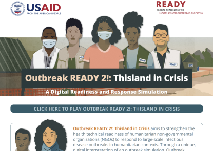 Outbreak READY 2!: Thisland in Crisis is an online digital simulation designed for humanitarian health practitioners. In Outbreak READY 2!: Thisland in Crisis, you take the role of a Health Program Manager leading the health response for a medium-sized, international NGO named READY. The NGO operates in Thisland, a fictitious, low-income country that has experienced recent civil conflict, mass displacement, and an influenza epidemic. The simulation is divided into three chapters that follow an evolving outbreak from the first detection to its spread throughout the population. As Health Program Manager, you will identify, assess, and interpret sources of data to plan and implement an integrated outbreak response that prioritizes communication and community engagement, protection principles, and staff safety and well-being.