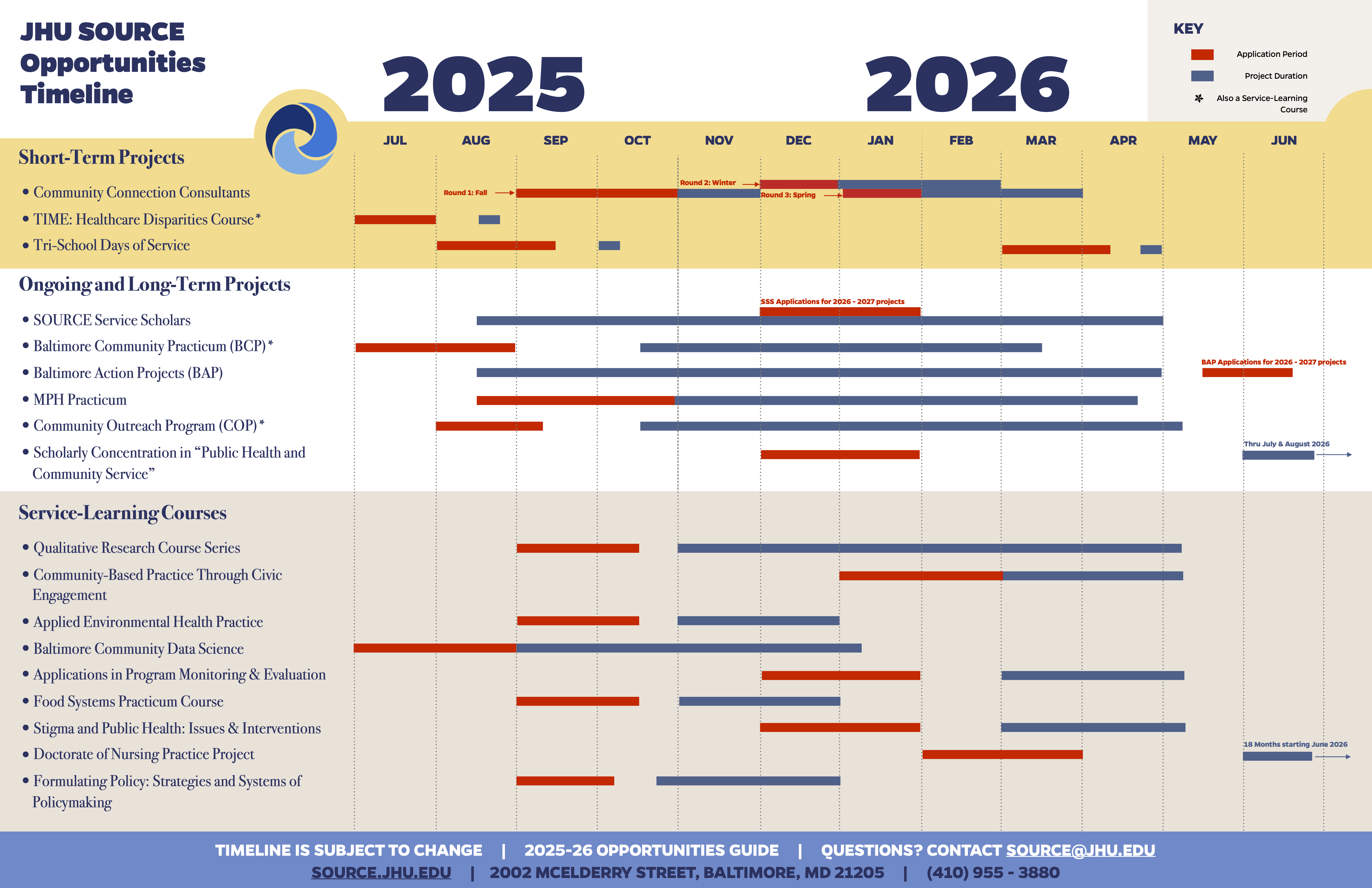 Use this resource as a visual aid for quick reference in locating timeframes for the various opportunities' application cycles. Dates are included for proposal submissions and project durations across the academic year. Questions? Contact SOURCE@jhu.edu.